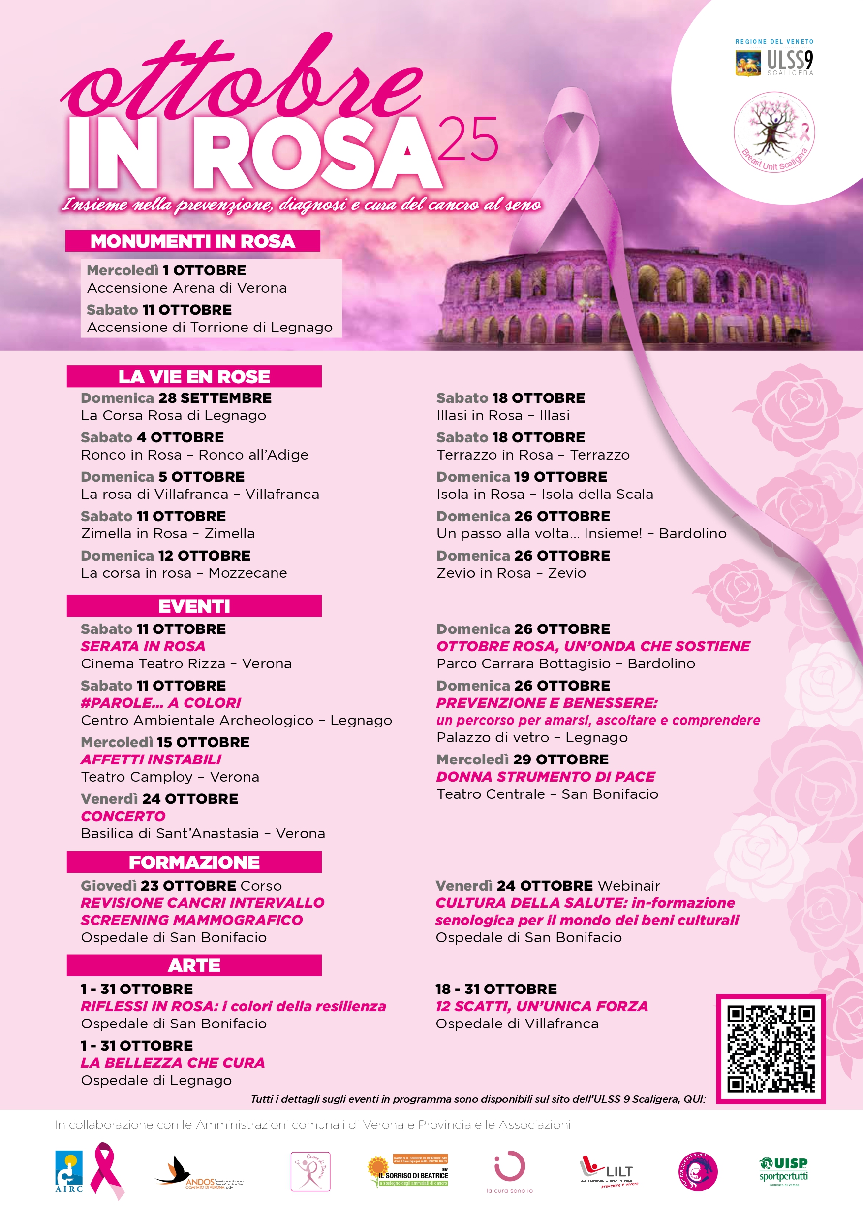 un calendario di iniziative attivate in collaborazione tra l'Azienda ULSS 9 Scaligera, l’Azienda Ospedaliera Universitaria Integrata, le Associazioni del Terzo Settore e i Comuni del territorio per sensibilizzare un numero sempre più ampio di donne sull'importanza della diagnosi precoce dei tumori della mammella, informando il pubblico femminile sugli stili di vita da adottare e sui controlli da effettuare.